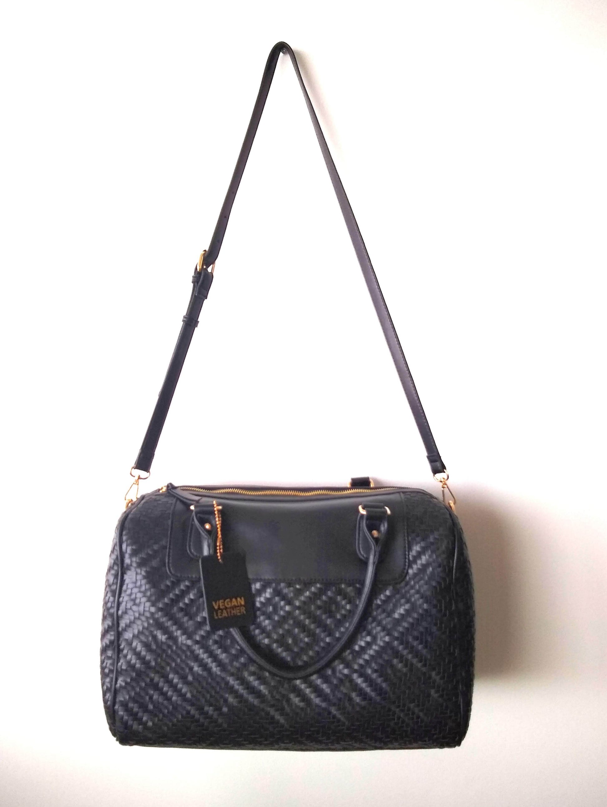 Classy, large, bowler tote. Perfect as a small weekend bag, diaper bag or work bag. Woven vegan leather detailing.