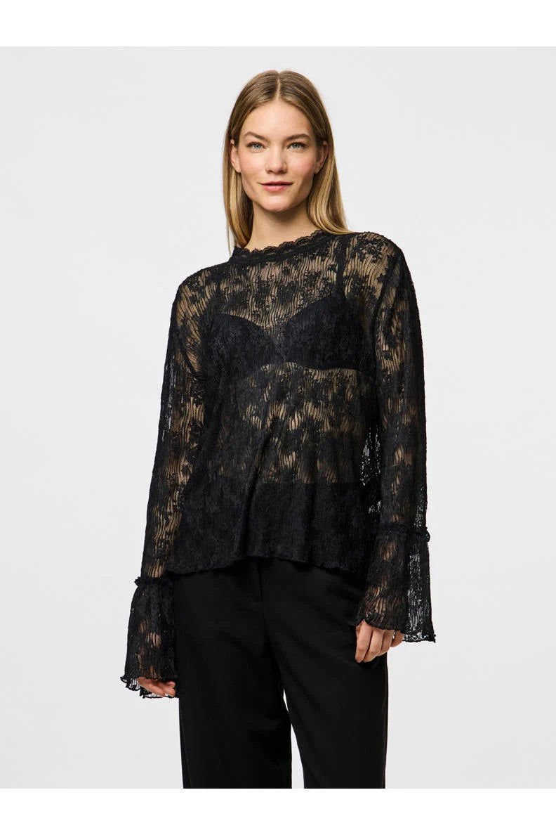This delicate floral lace top features intricate, lightweight lace detailing for an elegant and feminine look. Its breathable fabric and flattering fit make it perfect for both casual and dressy occasions.