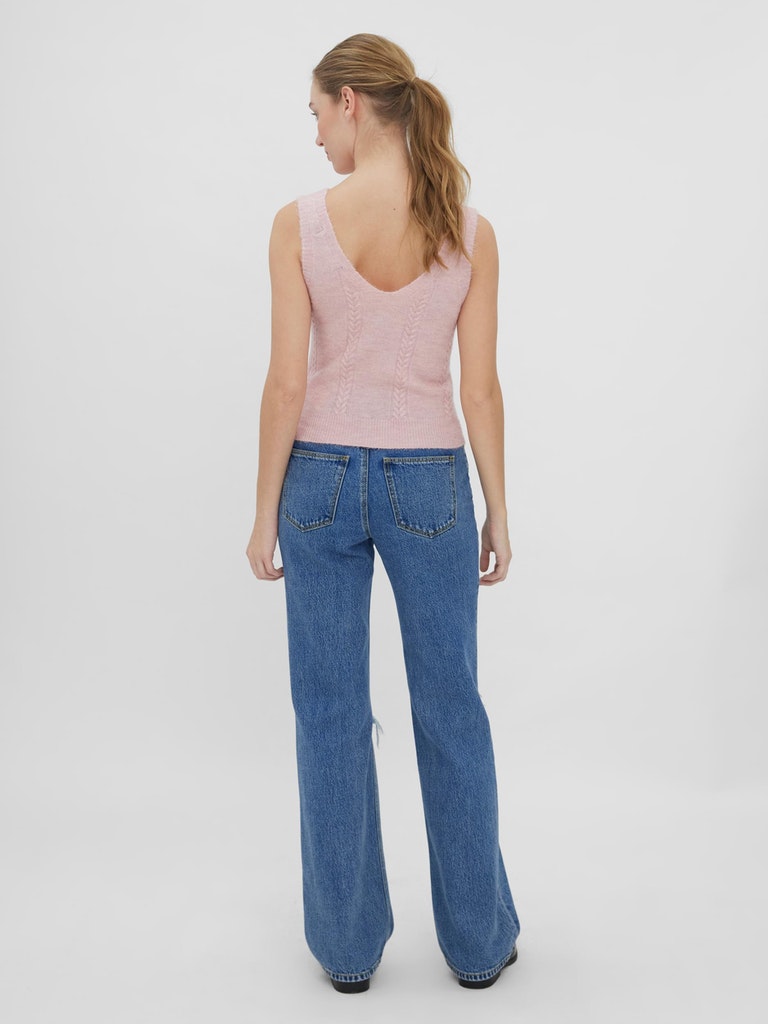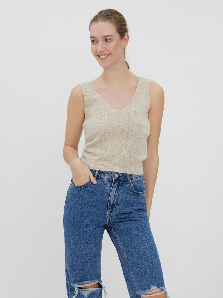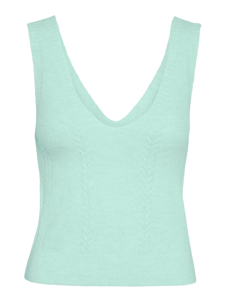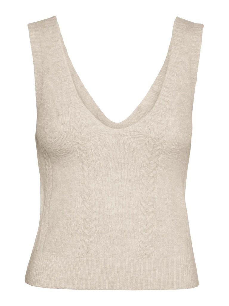 This knitted top has wide straps with a deep u-neck in the front and deep v-cut in the back. Cable knit detailing a long the front with ribbed details at neckline and hemlines. Style this cute top with a pair of jeans and some heels for a stylish look.