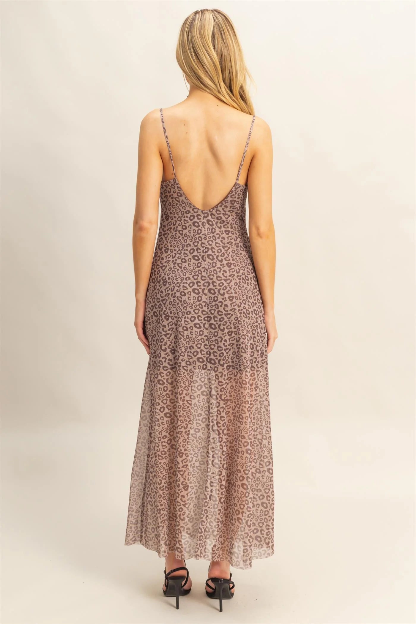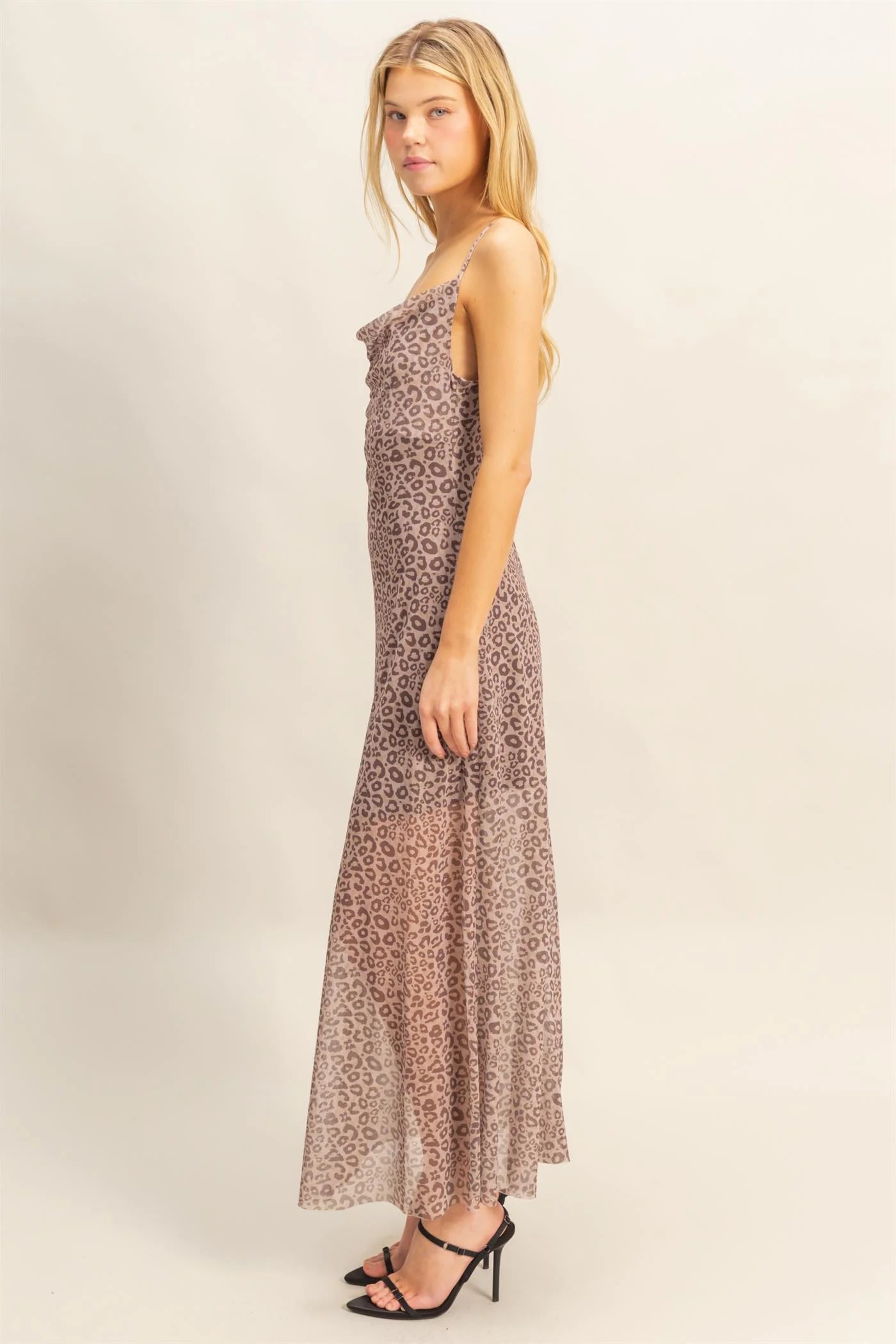We know you'll always look nice wearing this stunning dress. Decorated with an animal print, the mesh dress has dainty shoulder straps and a cowl neckline. It creates a curve-hugging silhouette that ends in a maxi dress.