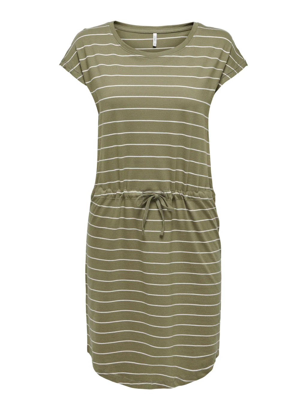 One of our classic spring/summer dresses. An easy dress to throw on in summer time. This is a loose fit with a rounded neckline and drawstring at waist to give a more fitted look if desired.