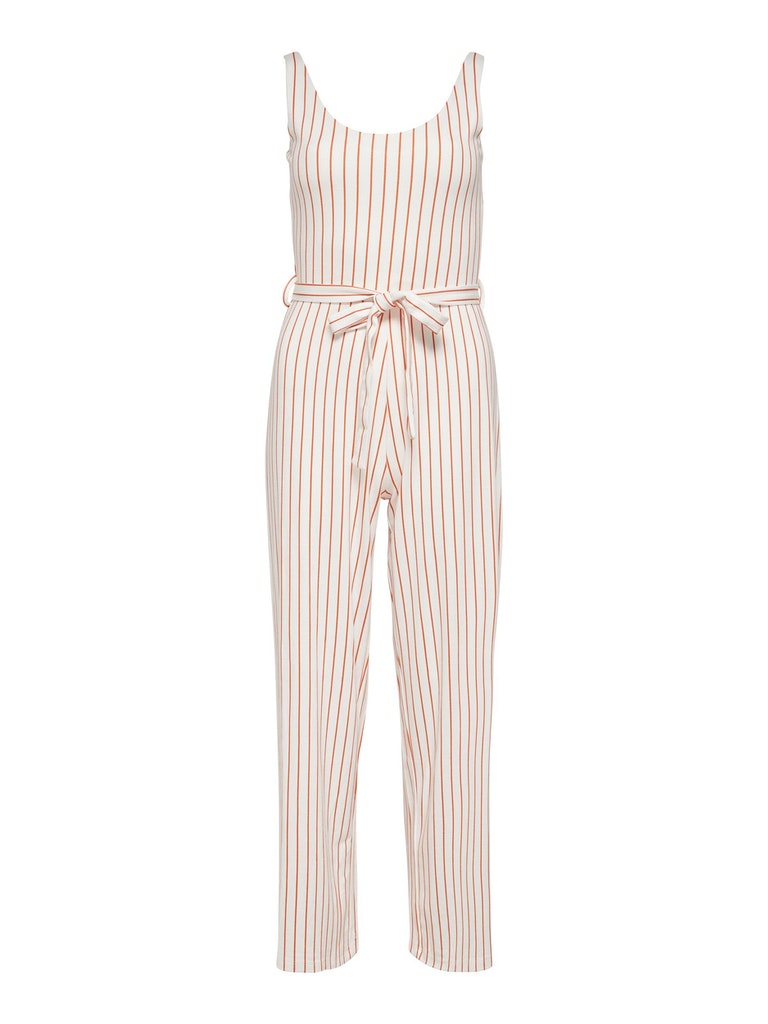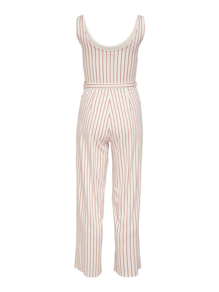 The Felia Jumpsuit can be both dressy and casual with its rounded neckline and pinstripe detailing. The pant area is a flattering ankle length wide leg fit and has an adjustable tie-belt at waist for extra definition.