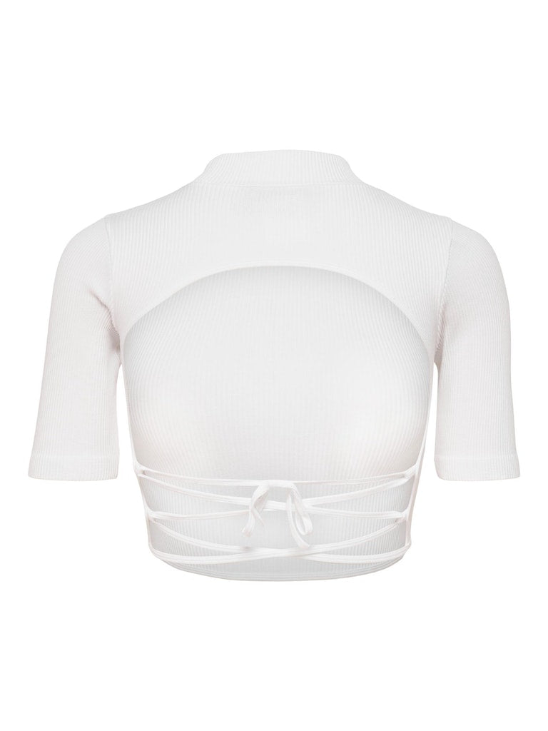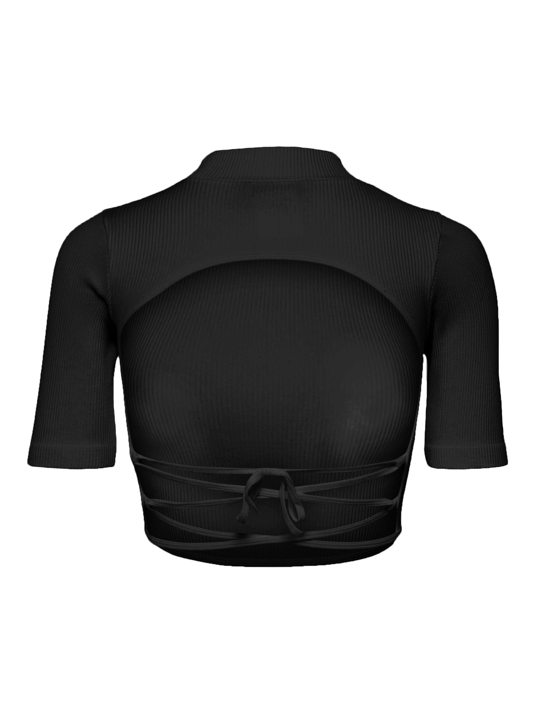 Super saucy high neck crop top with open back and tie-strings. It's all business in the front and party in the back. This top is slim fitted with short sleeves and is bad with a soft & stretchy material.