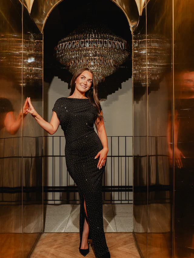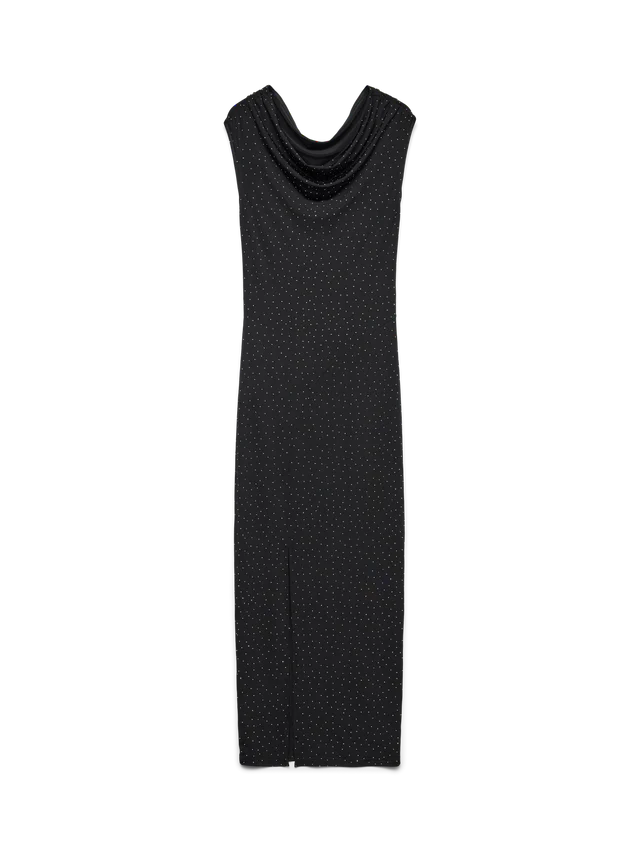 This dress features a gorgeous fit with a maxi length and a side slit. Adorned with rhinestones and made with a stretchy fabric for a comfortable fit.